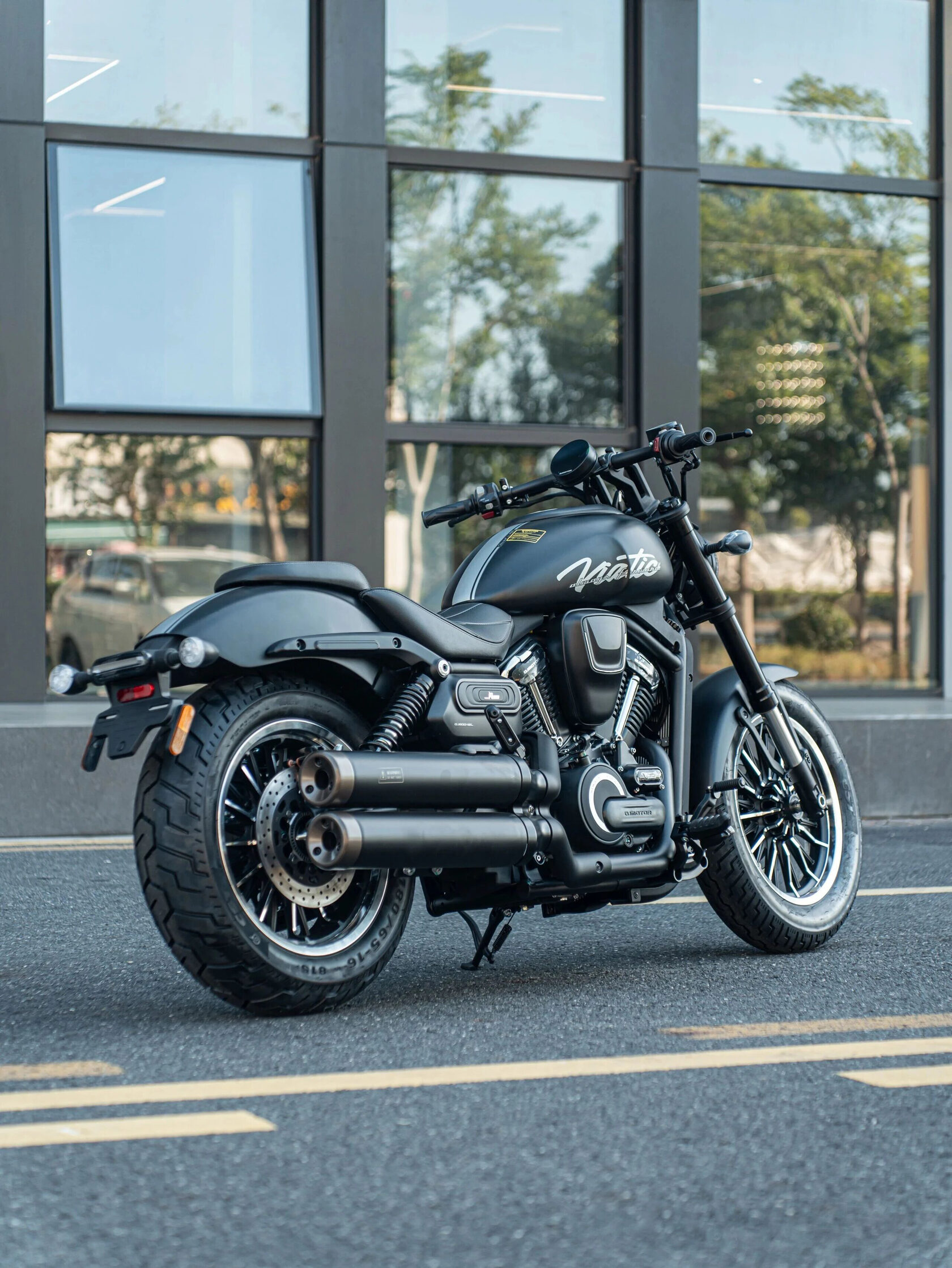 Сдвоенная выпускная система подчёркивает классический характер мотоцикла и формирует насыщенное звучание, присущее V-образным двигателям. Хромированные элементы и качественное лакокрасочное покрытие свидетельствуют о внимании к деталям на всех этапах производства.